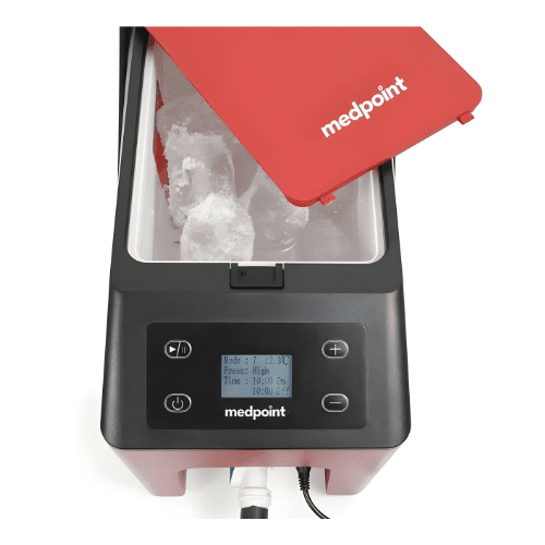 The device cools the affected area by circulating ice water inside the sleeve, which reduces inflammation and numbs pain.